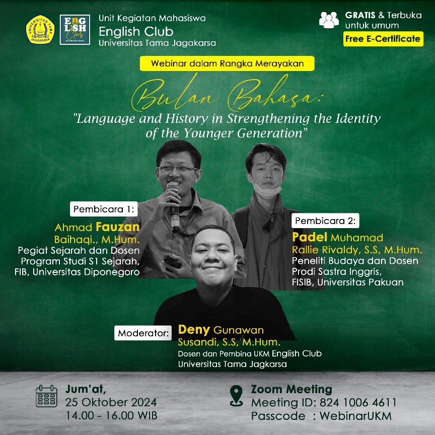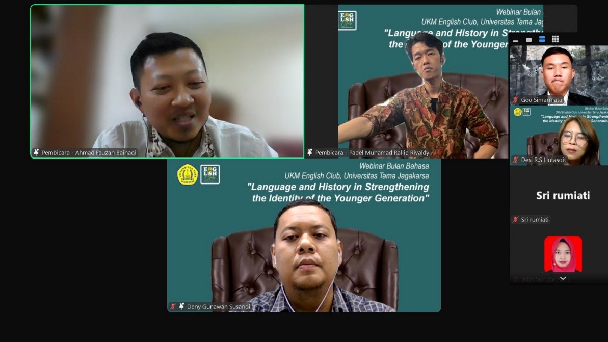 Jakarta, Universitas Tama Jagakarsa—Universitas Tama Jagakarsa, melalui Unit Kegiatan Mahasiswa (UKM) English Club, Universitas Tama Jagakarsa, sukses menggelar kegiatan Webinar berskala nasional dengan tema “Language and History in Strengthening the Identity of the Younger Generation” dalam rangka merayakan Bulan Bahasa tahun 2024.